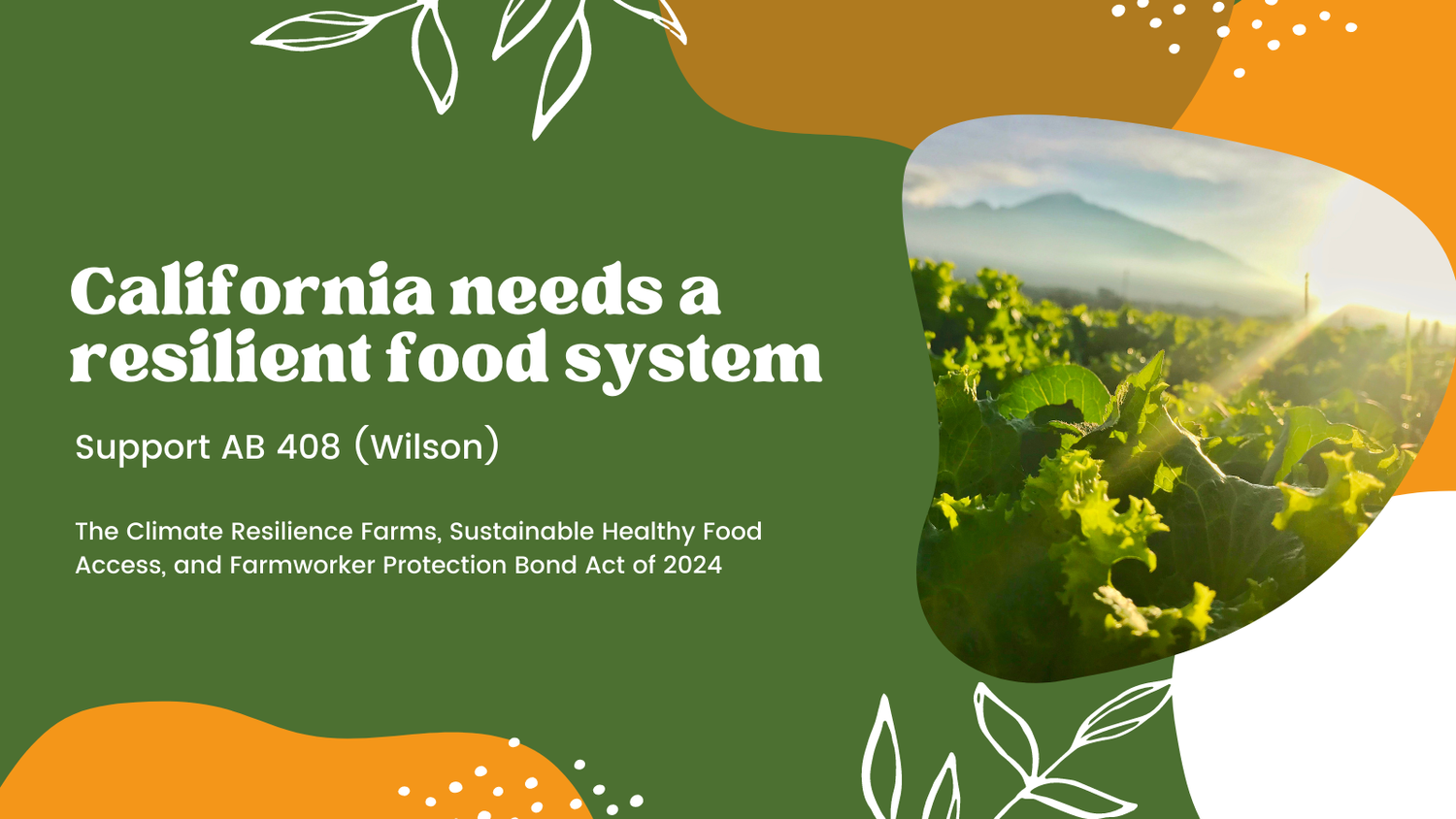 Get InvolvedPlease share the following information so we can reach out when there are opportunities to raise your voice! Name * First Name Last Name Email * Phone * (###) ### #### I represent or am a: * Farmer or rancher Non-profit or community-based organization Business Government office Myself, a concerned individual Other (indicate below) If you marked other: Name of your organization, business or farm, if applicable: Are you interested in meeting with your state legislator about this effort? * Yes No California Assembly district number (if you are an organization that serves multiple districts, please include them all): * By providing us your California State Assembly and Senate districts, we will have the information we need to alert you when there is a strategic opportunity to contact your state Senator or Assemblymember. You can quickly look it up here: http://findyourrep.legislature.ca.gov/ California Senate district number (if you are an organization that serves multiple districts, please include them all): * By providing us your California State Assembly and Senate districts, we will have the information we need to alert you when there is a strategic opportunity to contact your state Senator or Assemblymember. You can quickly look it up here: http://findyourrep.legislature.ca.gov/ Interest areas (check all that apply) * Regional Food Infrastructure Farmworker and Food Worker Safety Healthy Food Access for Vulnerable Populations Sustainable Agriculture & Compost Which of the following actions in support of the campaign may we contact you about this year? * Stay updated on the campaign Send a support letter Help organize a virtual "town hall" or other event in your district Share the campaign on social media Donate to the campaign Other ideas, offers or questions: Thank you! We look forward to working with you. If you have any questions, please contact resilientfoodsystem@gmail.com. “Never doubt that a small group of thoughtful committed citizens can change the world: indeed, it’s the only thing that ever has.” Margaret Mead